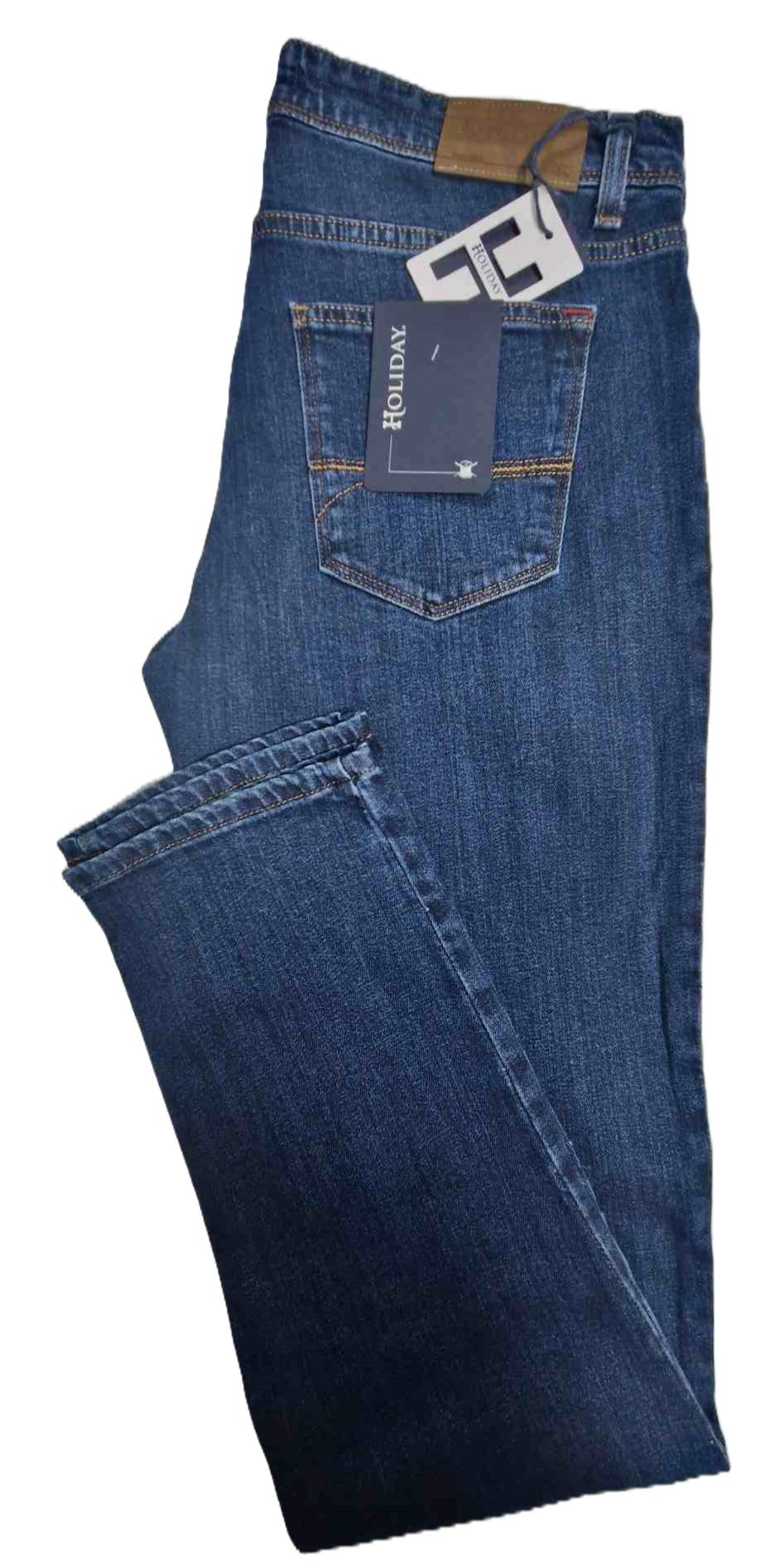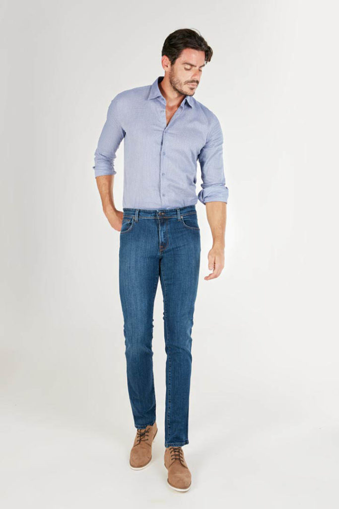 Il denim lavaggio tradizionale medio con impunture tabacco rappresenta un connubio perfetto per il modello ERIC, cinque tasche, realizzato nella vestibilità SLIM FIT, vita regolare su fondo gamba slim, in comodo denim stretch del peso di 12oz. Il modello in foto indossa la taglia 48. 98% cotone 2% elastan.