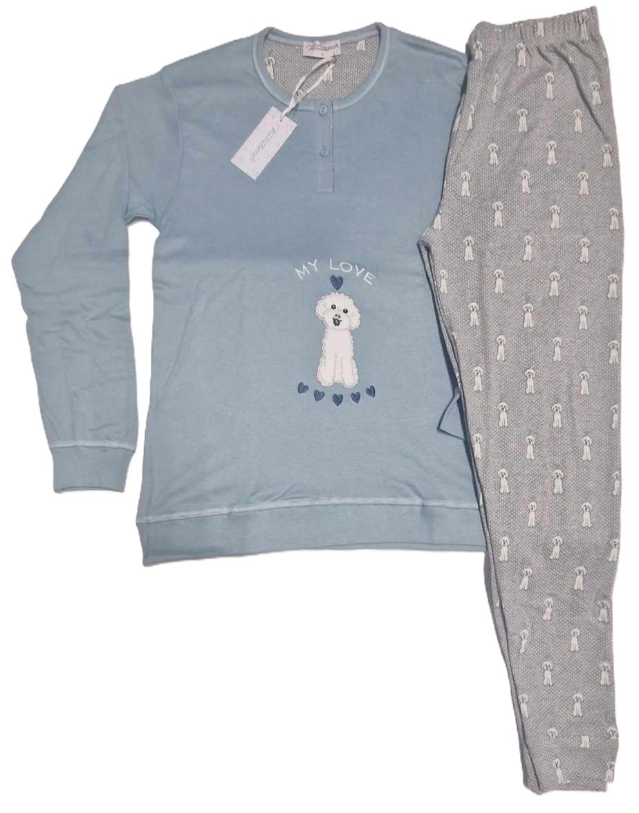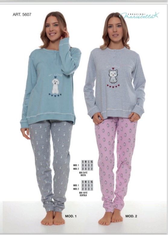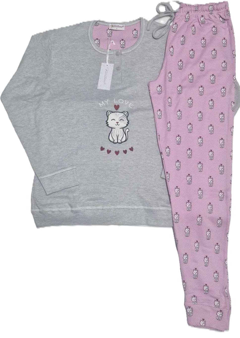 Due varianti di pigiama da donna in caldo cotone a fantasia e colori come da foto . La variante verde con un simpatico cagnolino e la variante grigia con un tenero gattino. Le maglie con scollatura a serafino con due bottoncini con dettagli che richiamano le fantasie dei pantaloni. Questi realizzati con polsino alle caviglie . La vestibilità è comoda e sono realizzati in puro cotone caldo 100%, ottima la qualità e resistenti a moltissimi lavaggi in lavatrice.