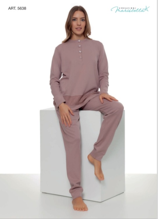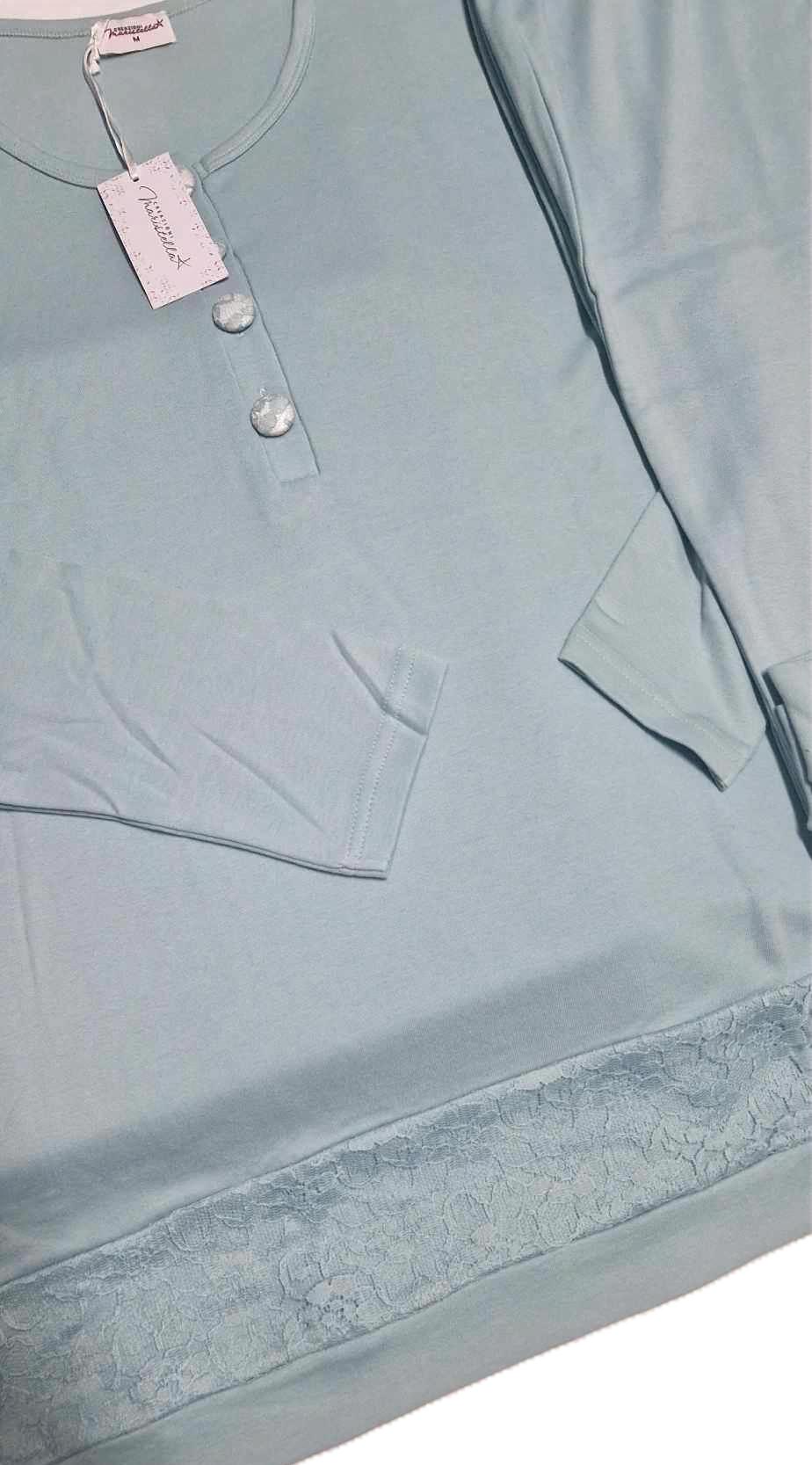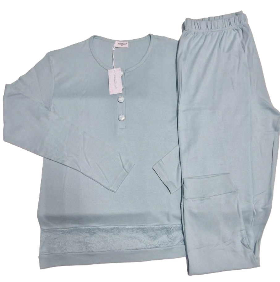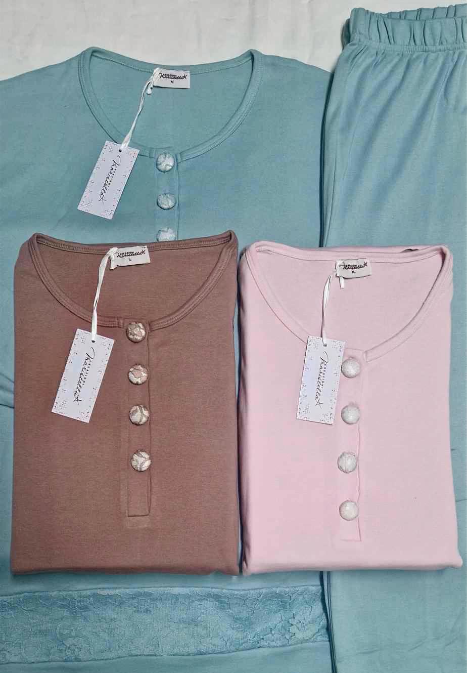 Molto elegante e fine questo pigiama realizzato in tre colori come da foto, Verdino, Rosa e Cioccolato. La maglia presenta una bella applicazione in pizzo sulla parte bassa, scollatura a serafino con quattro bottoni rivestiti dalla stesso tessuto dell’applicazione. Il pantalone semplice e dalla vestibilità comoda è realizzato con polsini alle caviglie. Semplice ma allo stesso tempo fine ed elegante, Caldo cotone 100% di ottima qualità e fattura.