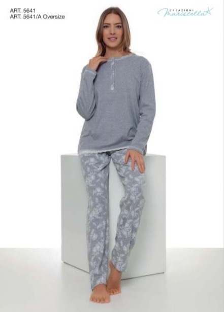 Elegante pigiama donna della linea Creazioni Maristella. Tessuto in caldo cotone 100% molto fine e con una mano leggera. La maglia realizzata con bottoni al collo e con dettagli che richiamano la fantasia del pantalone. Questo è stato pensato con una gamba regolare e senza polsini alle caviglie proprio per esprimere al meglio l’eleganza del capo. Realizzato in tre colori come da foto e adatto per chi cerca un pigiama dai toni sobri ed eleganti, di qualità a prezzo conveniente.