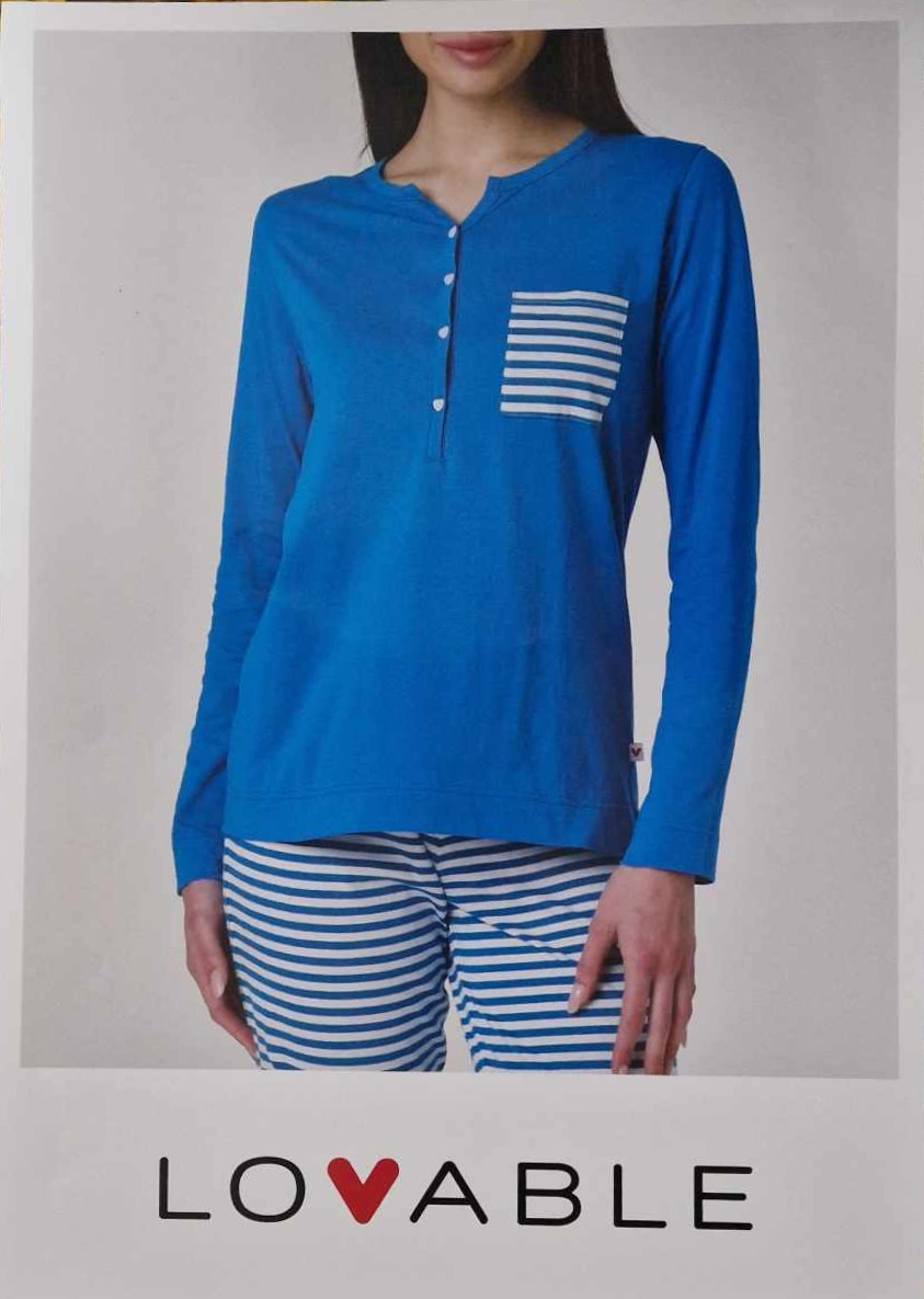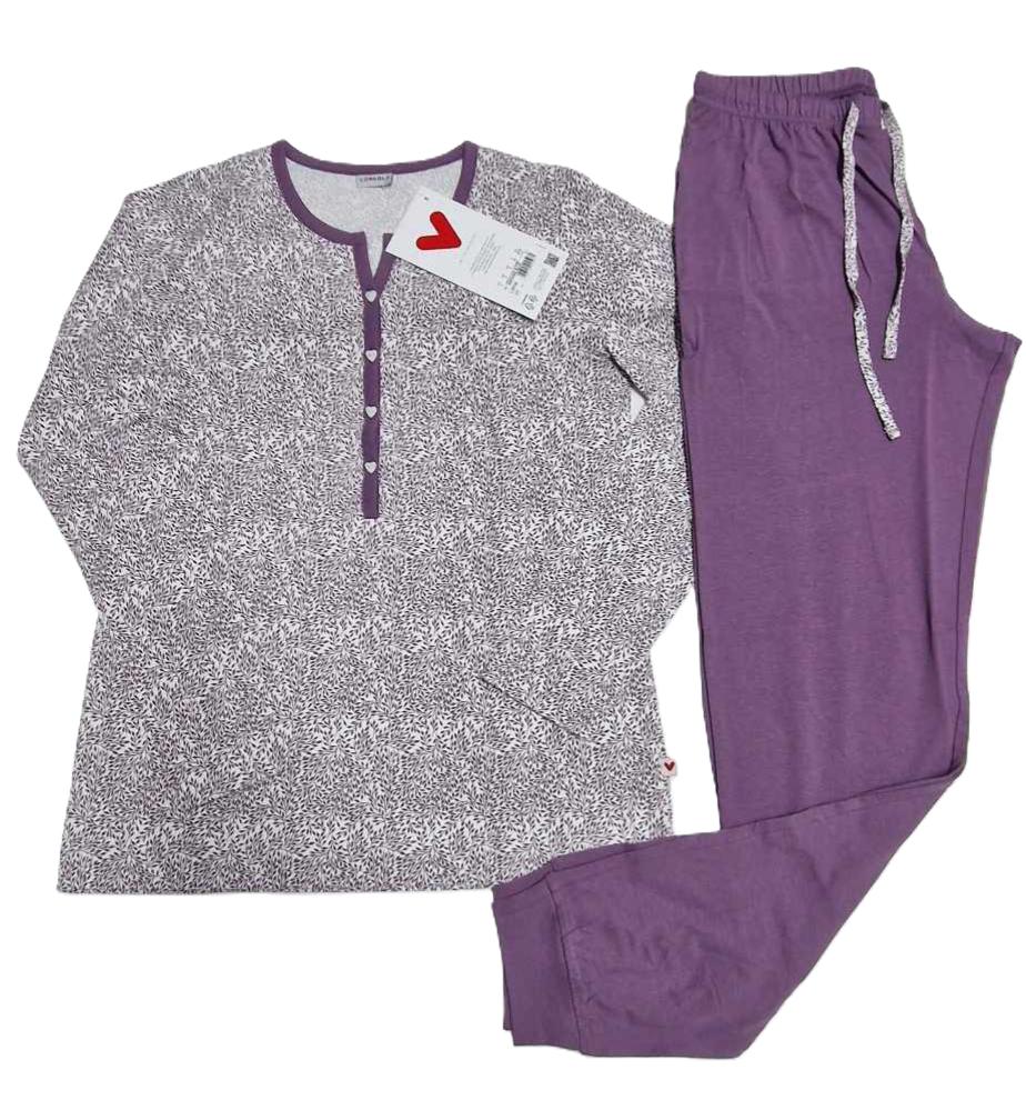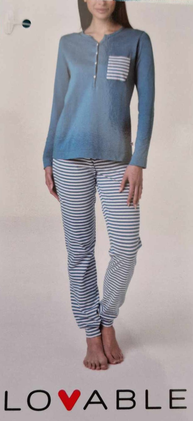 Due bellissime varianti di pigiama da donna di Lovable dai colori decisi e dinamici. La maglia ha una scollatura a serafino con quattro bottoni a forma di cuoricini, il pantalone è realizzato con polsini alle caviglie e coulisse in vita. La composizione è 100% cotone di ottima qualità, al tatto si presenta molto fine e fresco.