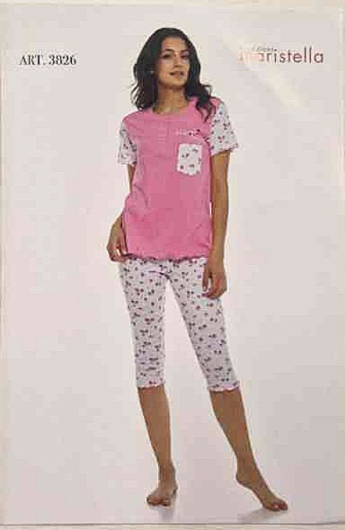 Pigiama donna manica corta e pinocchietto in puro cotone 100%. Maglia a manica corta e con scollo a serafino 3 bottoni con maniche e taschino che richiamano la fantasia della parte bassa. Comodo pinocchietto con elastico in vita . Realizzato in puro cotone 100 % di qualità fine per garantire freschezza nei mesi caldi.