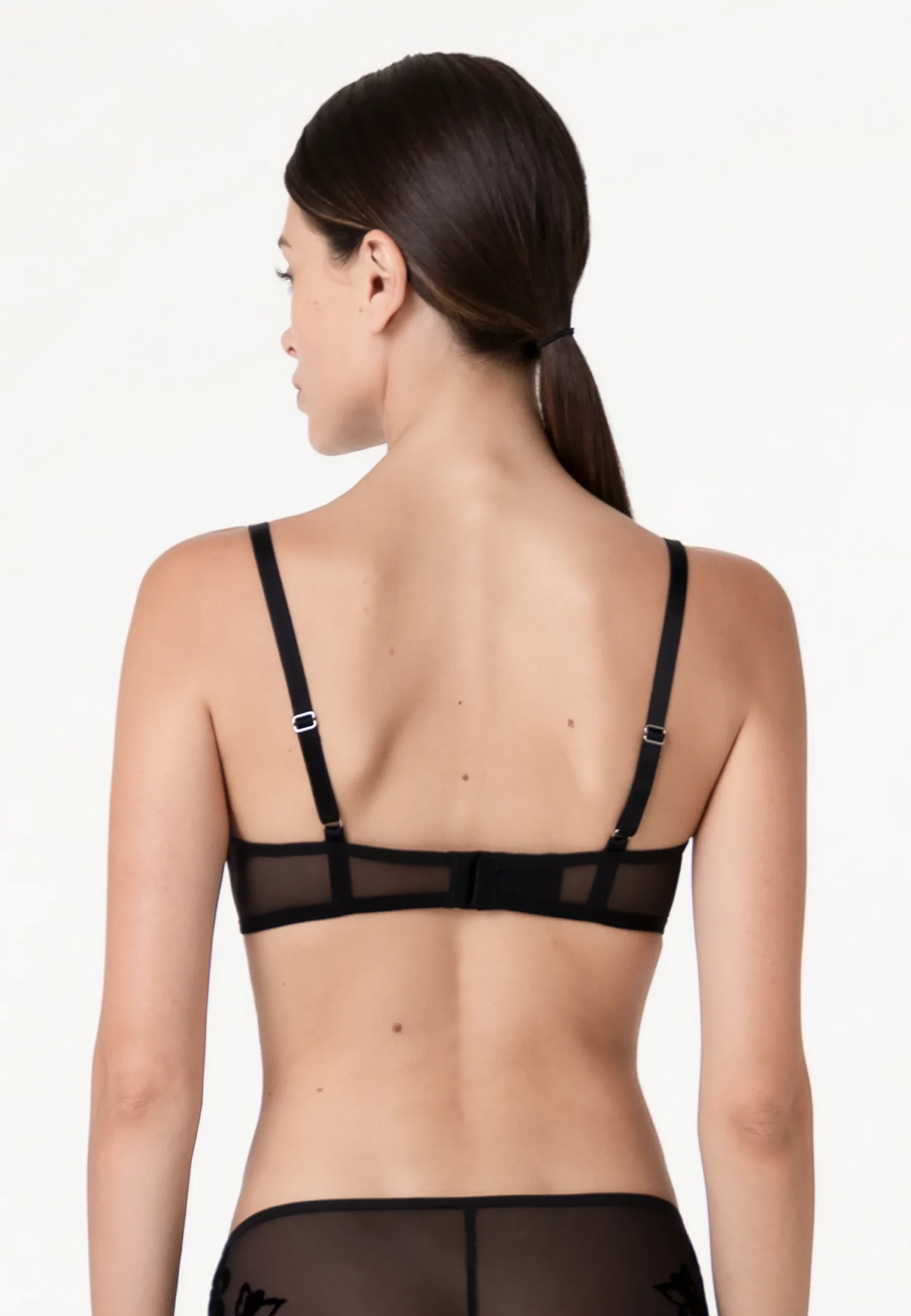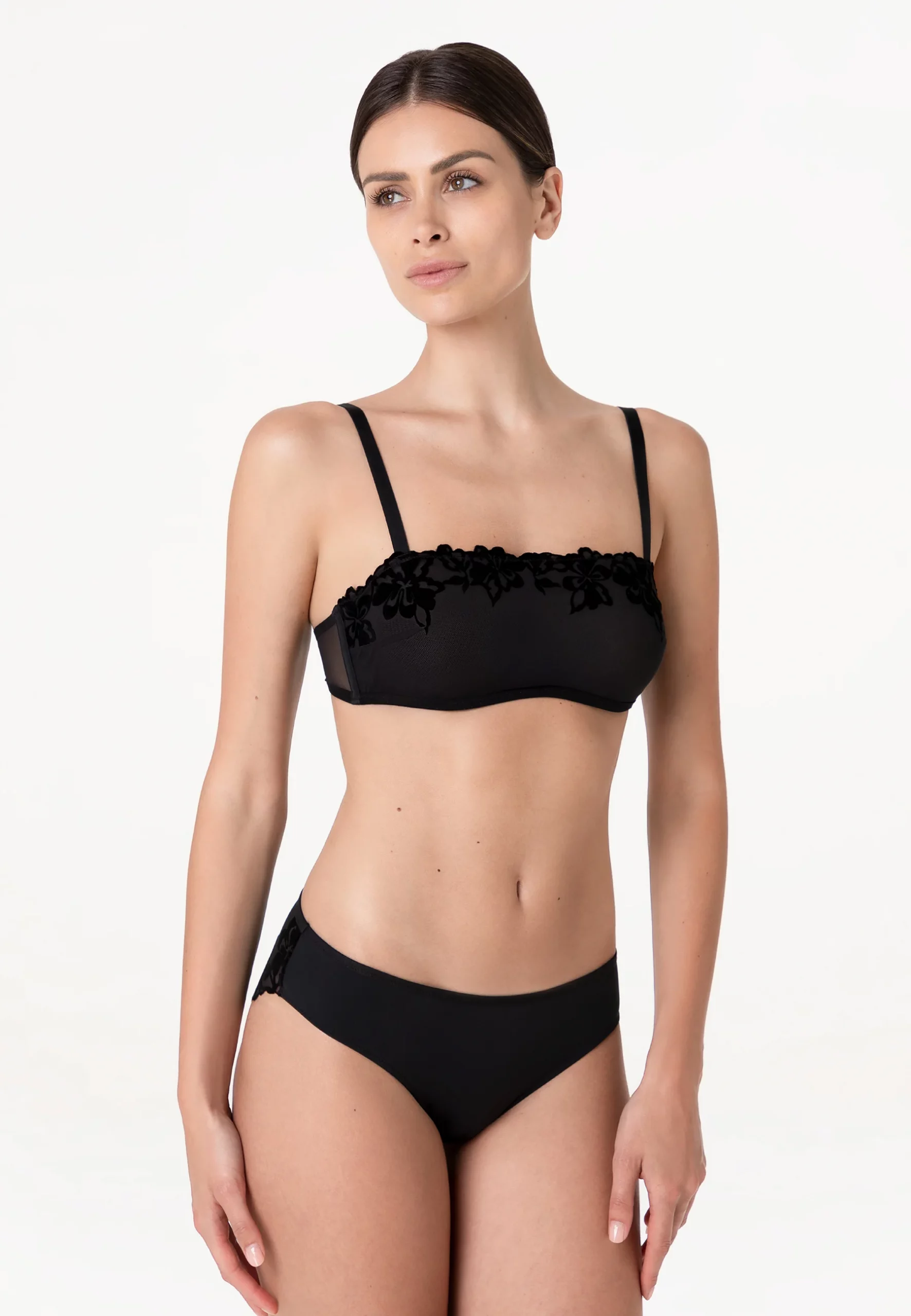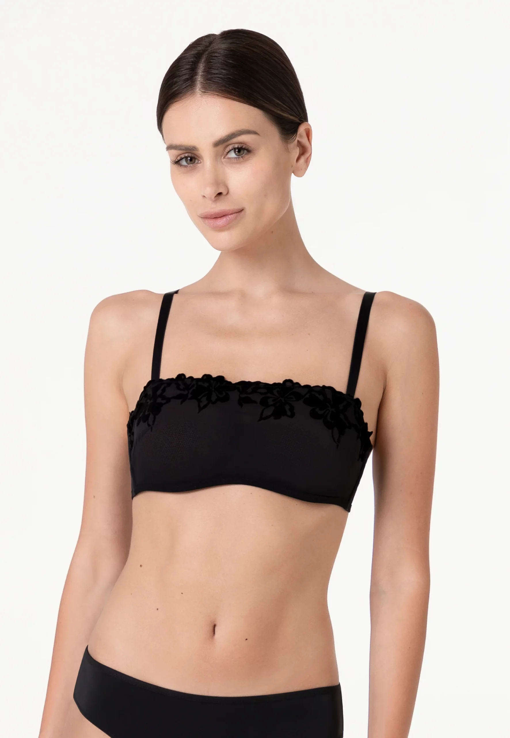 Il reggiseno a fascia con ferretto della linea Velvet Embroidery in nero è pensato per valorizzare il décolleté con una femminilità raffinata e contemporanea. La struttura interna con ferretto offre sostegno e stabilità, mantenendo una linea pulita e armoniosa sul corpo.Il colore nero intensifica l’effetto del velluto floccato e rende questo reggiseno ideale per un’intimità elegante e curata nei dettagli, perfetta anche sotto abiti più scollati. Abbinalo con lo slip.