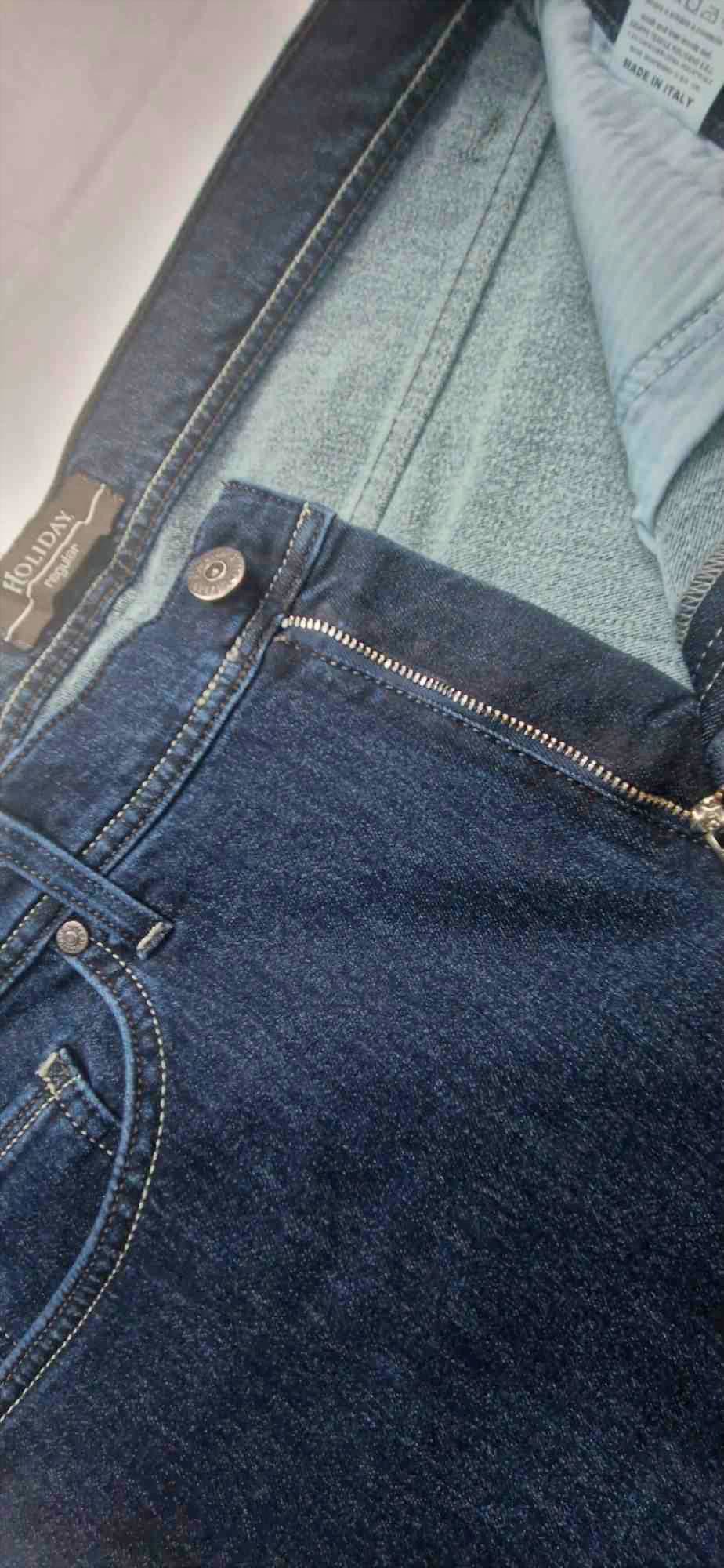 Articolo fondamentale della collezione Jeans Holiday è VICKY. Jeans realizzato in un morbidissimo tessuto elasticizzato con un leggero stato di felpa in caldo cotone a contatto con la pelle. Questo rende Vicky un Jeans caldo per chi sente freddo o per i mesi più rigidi ma allo stesso modo molto morbido leggero e comodo nei movimenti. Jeans ideale per chi è alla ricerca di un pantalone caldo ma senza rinunciare ad indossare un Denim alla moda e performante. Comp. 70%cotone 28%poliestere 2%elastan